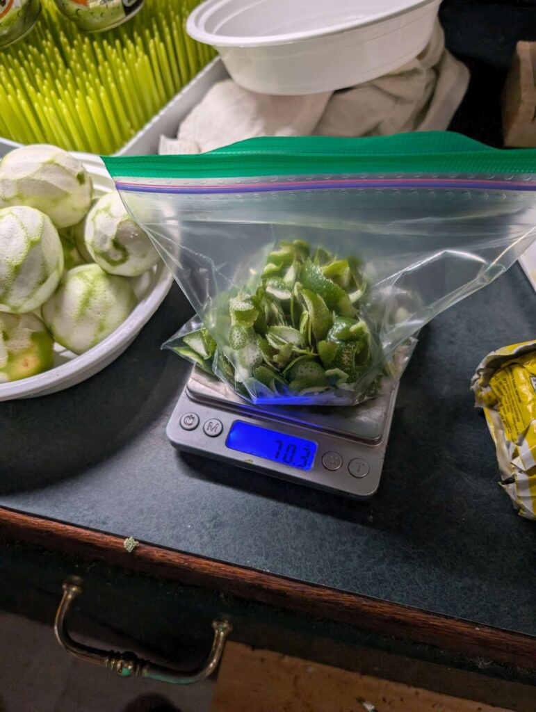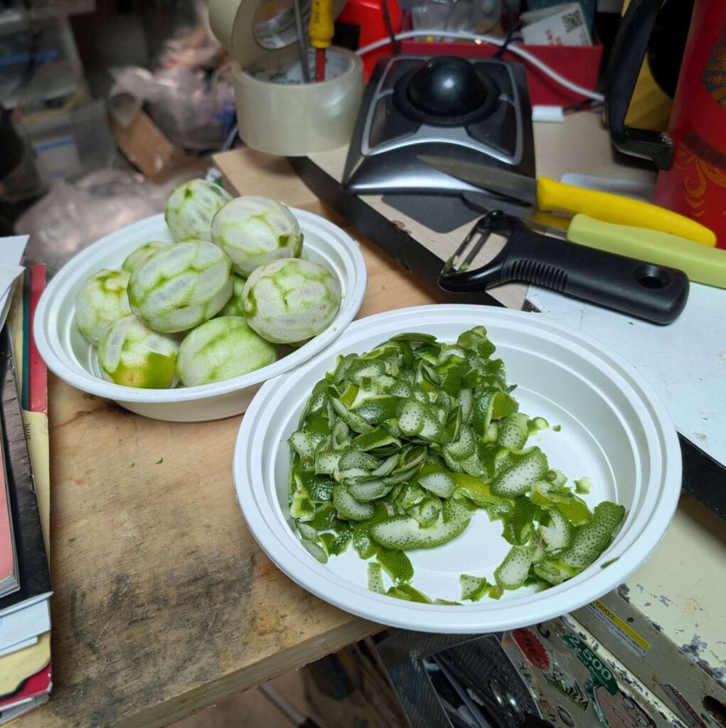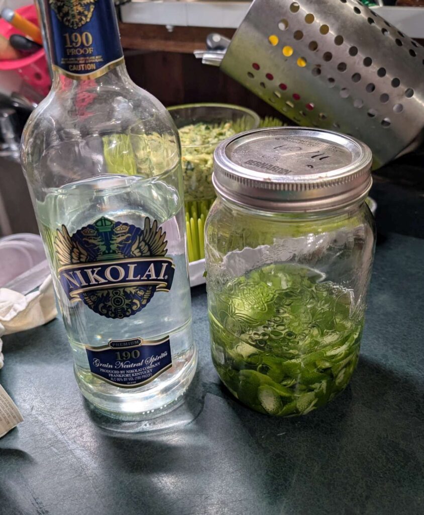 — 2025-07-14 – Monday – 70g lime skin into ~333ml Everclear clone 190 proof 90%; shake multiple times per day for 2 weeks