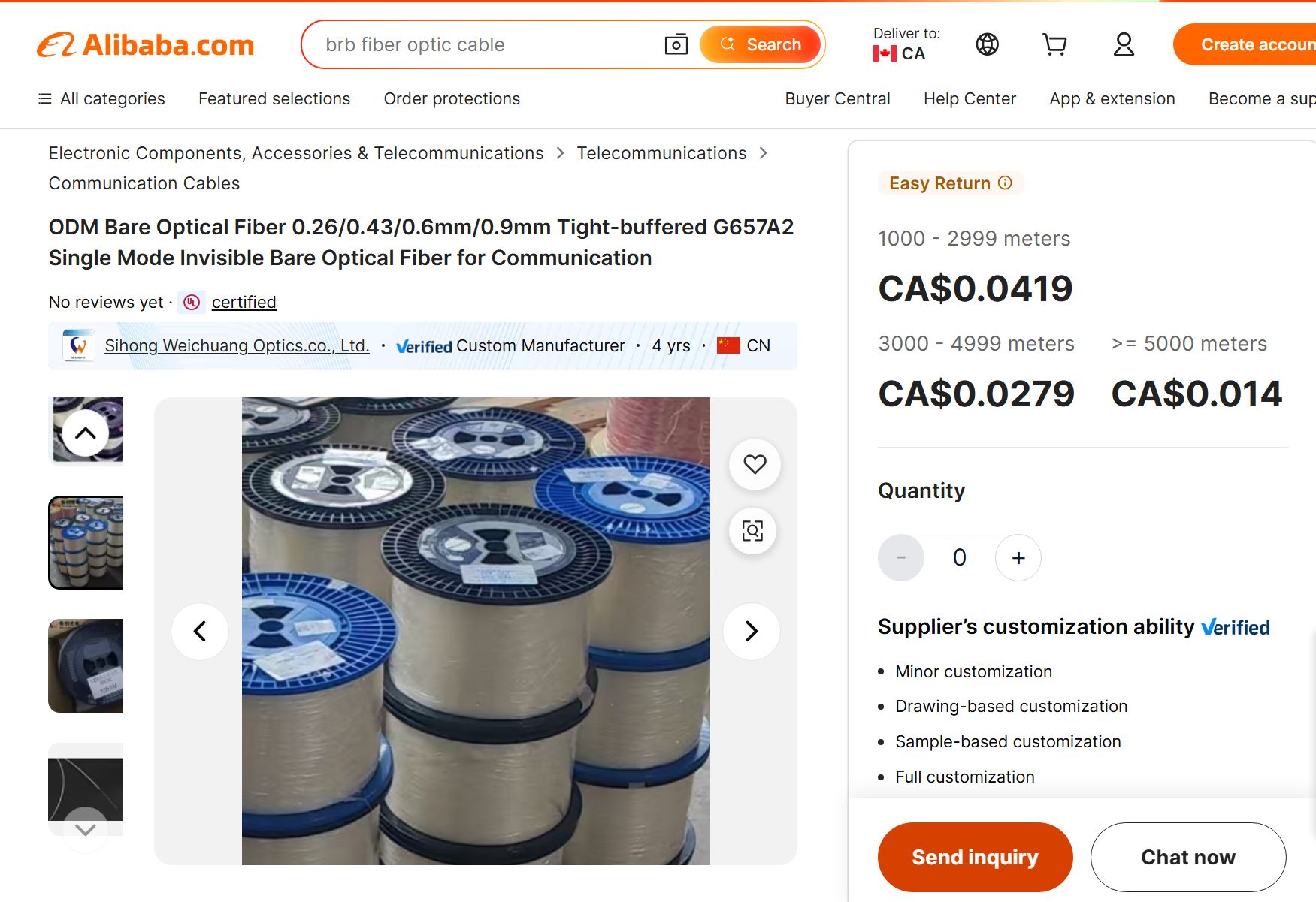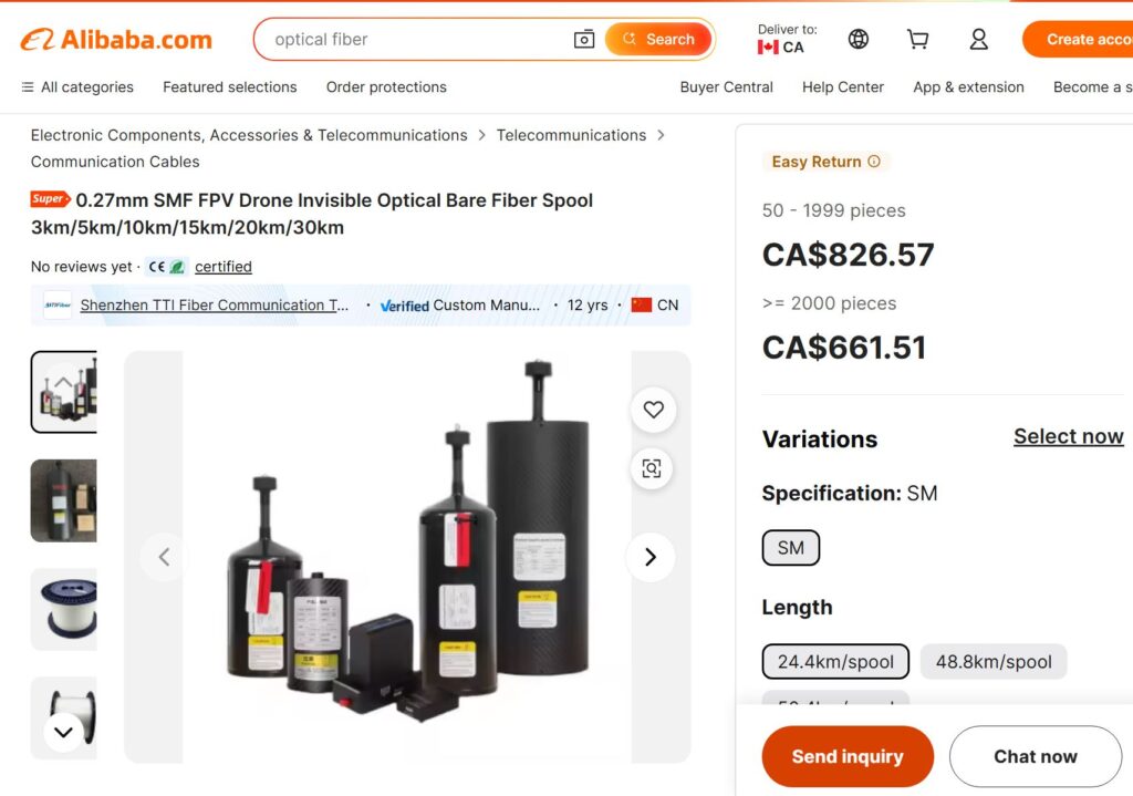 optic drones used by both sides of the russian war on ukraine. collected some of what i’ve seen on the ‘net. wondering about where one would purchase such stuff; not just huge spools, but already packaged for use on a drone. i think we both said “china!”. so i looked up “optical fiber spool fpv drone” at alibaba.com and got exactly what i wanted:here’s some related finds.