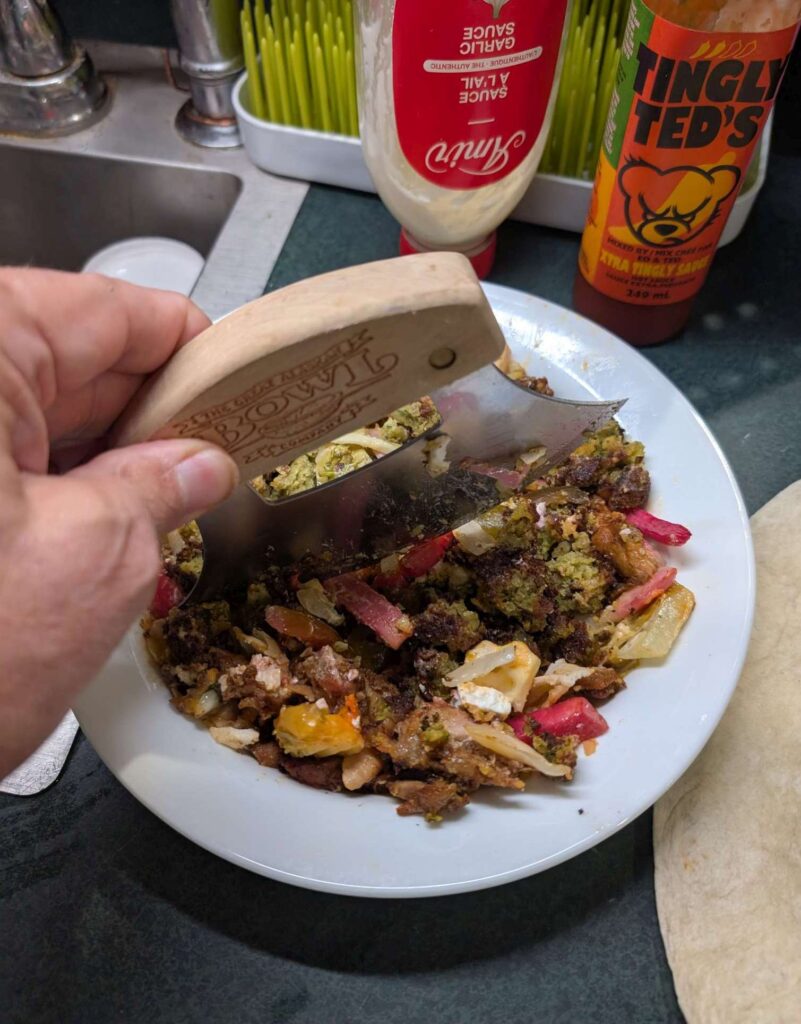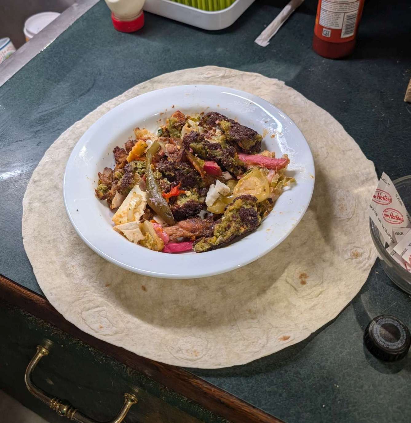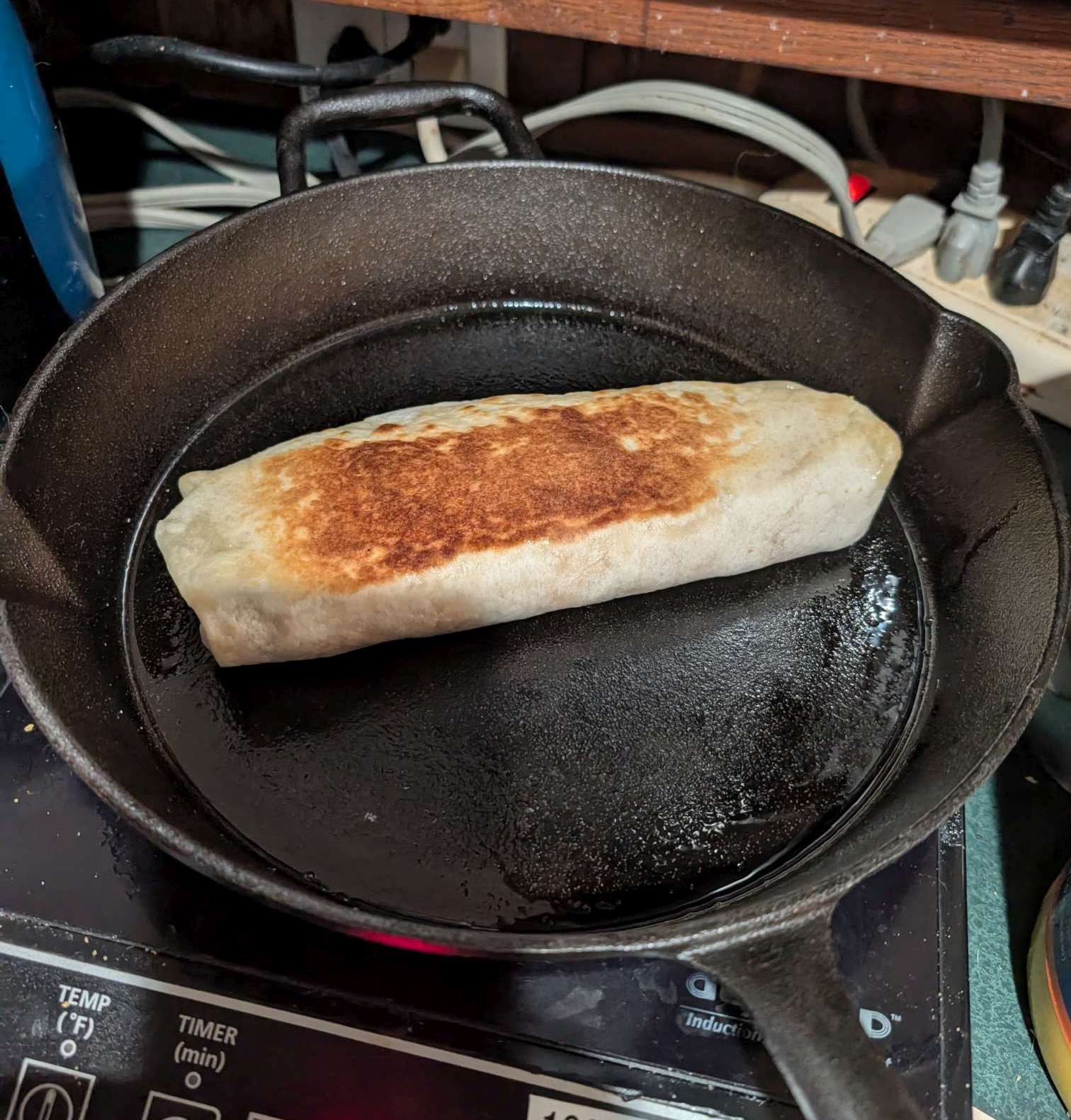 joan brought home a Ariyana Falafel for me, and some leftover chicken shawarma. Problem a leftrover wrap like this is basically inedible from various sauces being absorbed into the wrap. so i disassembled both, chopped the good stuff, trashed green-wasted the soggy remains, reheated the good stuff, rolled it into a burrito wrap, toasted in the cost iron pan. Perhaps this is “fusion” (middle eastern falafel & chicken shawarma + alaskan knife + mexican burrito + indian ghee?) I don’t know, but it sure was tasty!