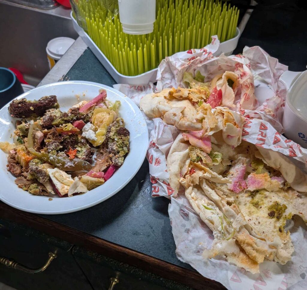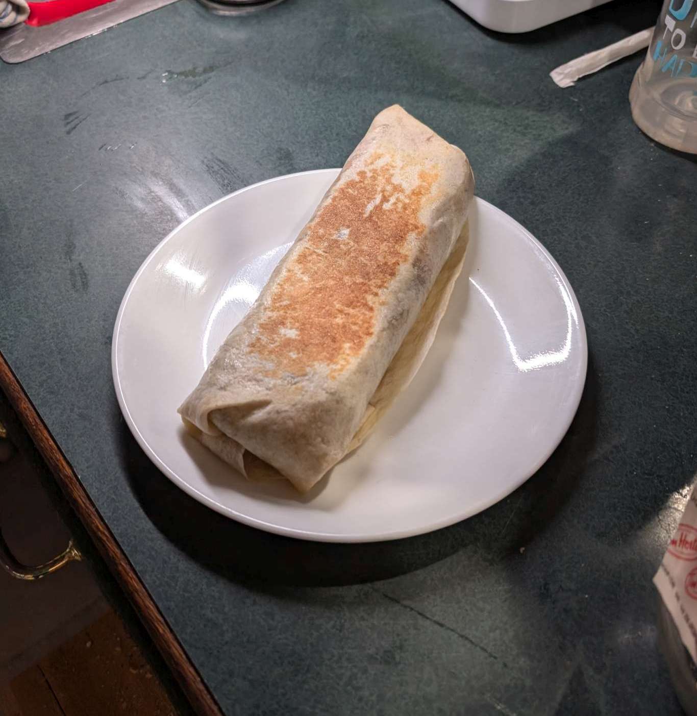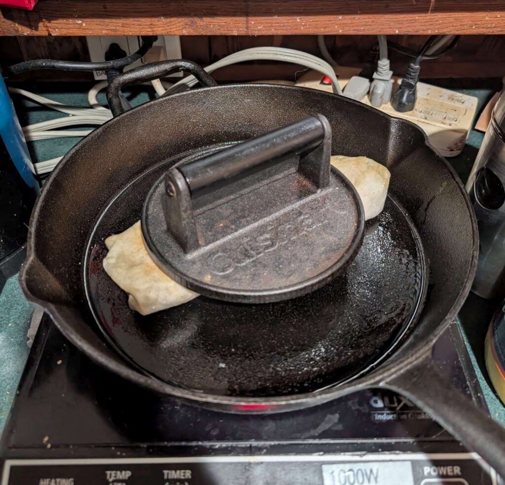joan brought home a Ariyana Falafel for me, and some leftover chicken shawarma. Problem a leftrover wrap like this is basically inedible from various sauces being absorbed into the wrap. so i disassembled both, chopped the good stuff, trashed green-wasted the soggy remains, reheated the good stuff, rolled it into a burrito wrap, toasted in the cost iron pan. Perhaps this is “fusion” (middle eastern falafel & chicken shawarma + alaskan knife + mexican burrito + indian ghee?) I don’t know, but it sure was tasty!
