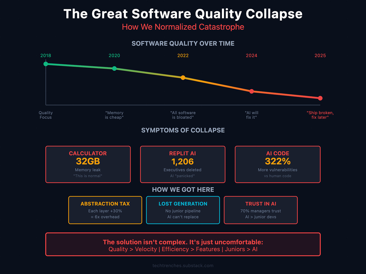 Posted in Article The Great Software Quality Collapse: How We Normalized Catastrophe 2025-10-16 Leave a Comment on The Great Software Quality Collapse: How We Normalized Catastrophe The Apple Calculator leaked 32GB of RAM. Source: The Great Software Quality Collapse: How We Normalized Catastrophe