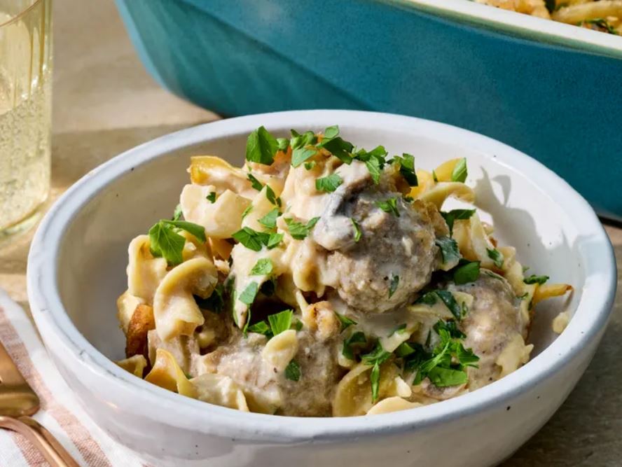 - Layer Ingredients: Add the onion, garlic, and sliced mushrooms. Add the frozen meatballs. Finally, top with the uncooked egg noodles.