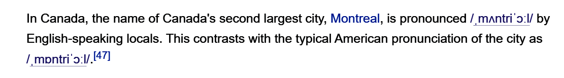 Posted in Article IPA Reader – reads pronunciation strings in IPA, reads in English 2025-12-01 Leave a Comment on IPA Reader – reads pronunciation strings in IPA, reads in English IPA Reader – International Phonetic Alphabet (IPA) reader. for instance, Montreal is pronouced differently: In Canada, the name of Canada’s second largest city, Montreal, is pronounced /ˌmʌntriˈɔːl/ by English-speaking locals. This contrasts with the typical American pronunciation of the city as /ˌmɒntriˈɔːl/.[47]