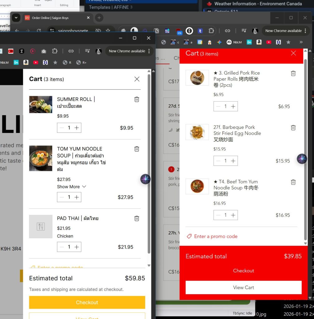 yikes! 20$ more? tbf, not samesame… piclked pad thai vs. pork lo main.and the soup look a little more fancy (crispy pork? crispy fried egg? not ssure how that will work in a takeout.., a perfect crispy fried with liquid yolk is the target, and it will not survce the 15min trip from the restaunt to the table. )