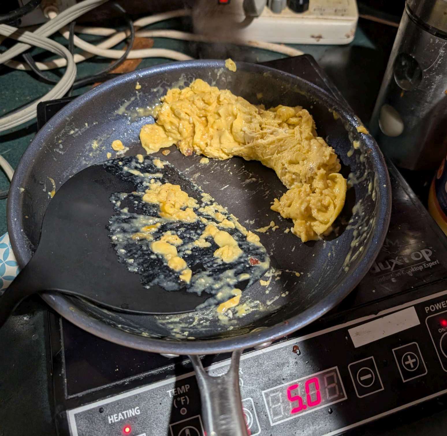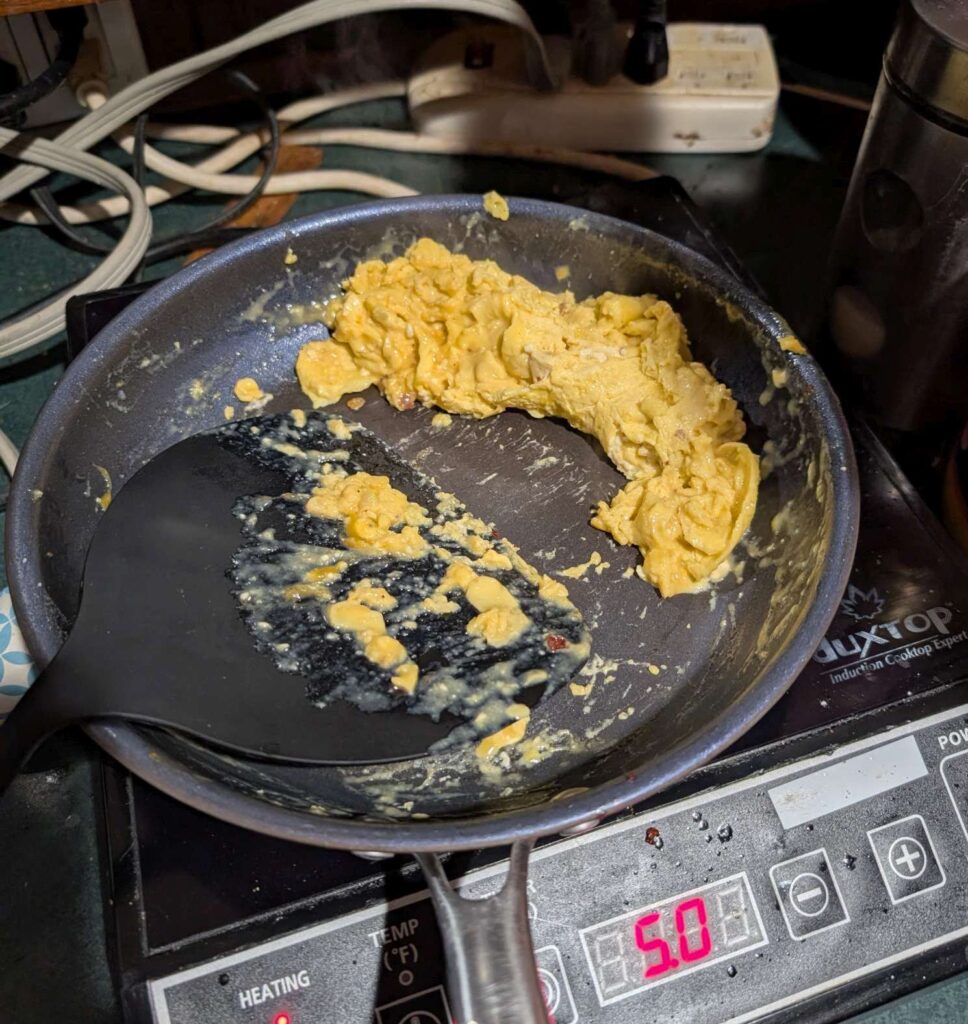 tried to make the omelettes as soft as possible, after watching this video; did require a hotter pan (leave on 5, moderate by lifting away (need to quiet the beep when no metal on surface!); still feels like i’m making scrambled eggs. got pretty close this time.