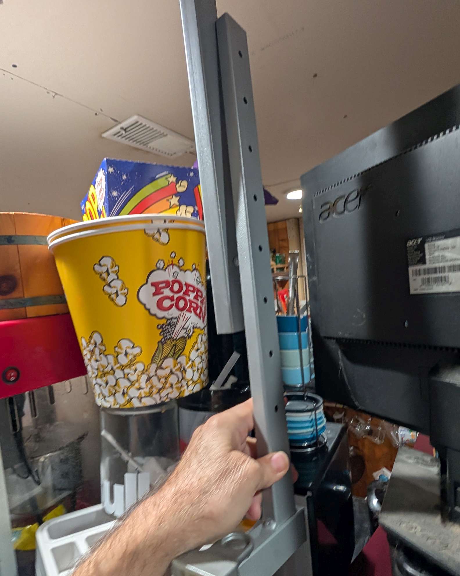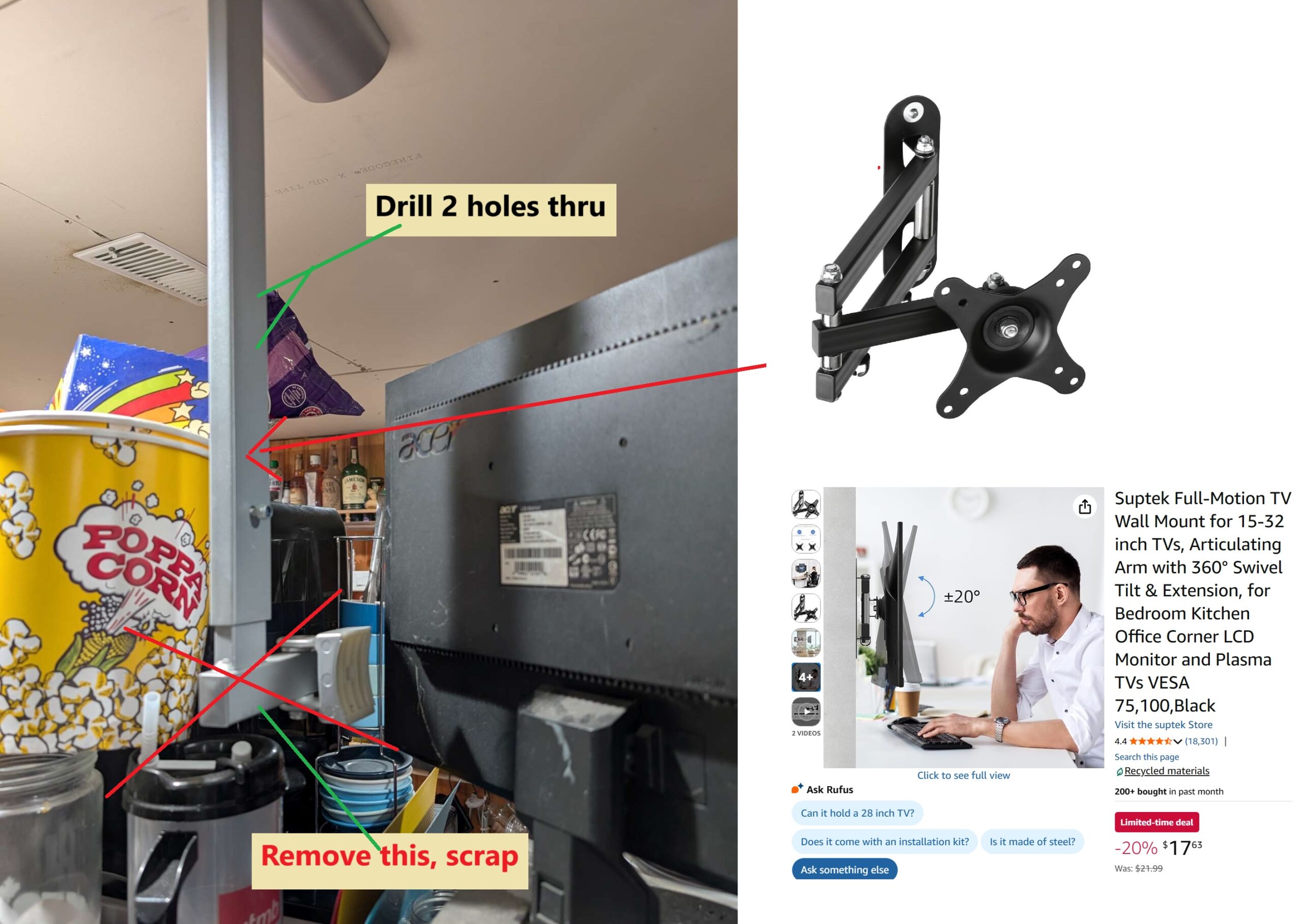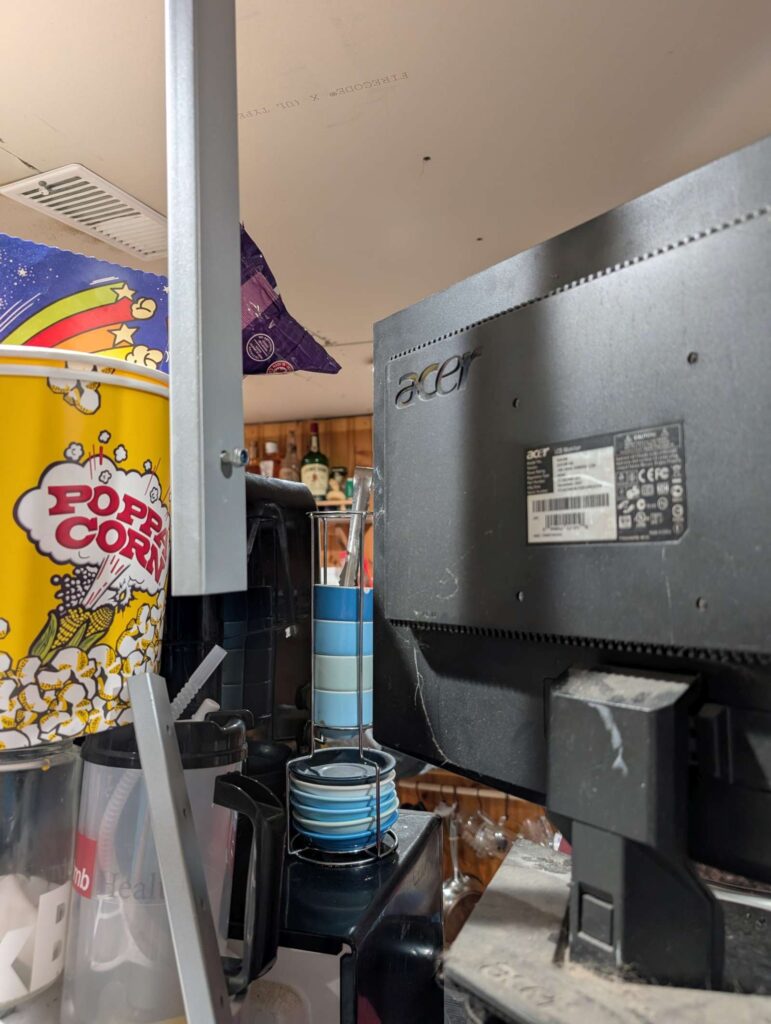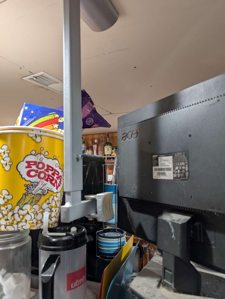 mount a small monitor from ceiling; use roku (but this monitor only has DVI input, does converter hdmi.F to DVI.M?; can i use roku app to see .pdf files from //nas2/food?; install plex, youtube, pdf reader; maybe use vmedia box, is hdmi oiutput, but no remote!)