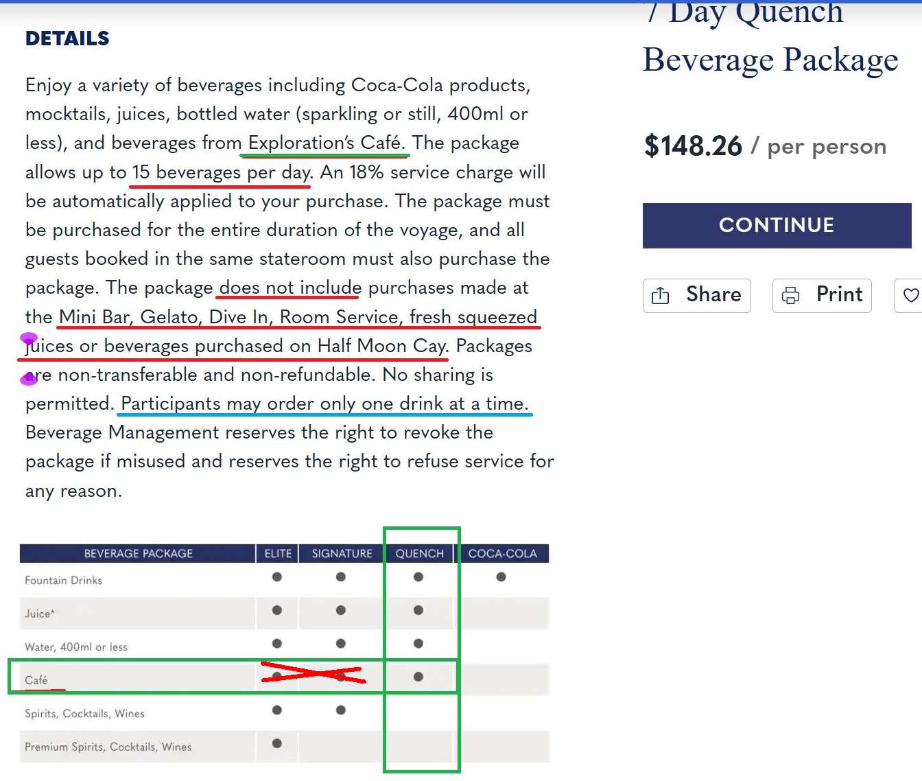 drink package: we (joan and I) and mom?? have the “quench” package, 15 drinks from “Explorations Cafe” (which I cannot find on any of the deck maps!!!).