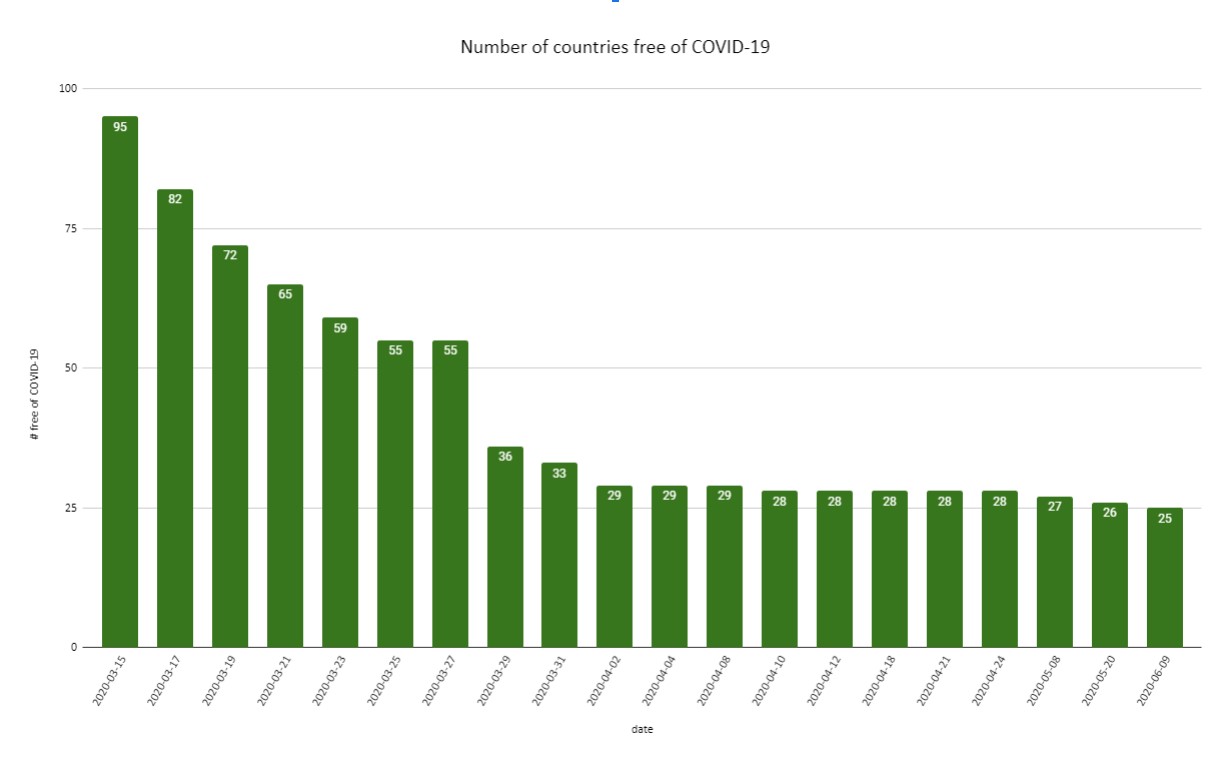 Updated 2020-06-09, with 25 countries reporting no COVID-19 cases.