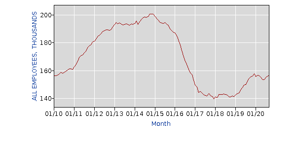Oil & Gas Extraction: peaked at ~200k in 2015.