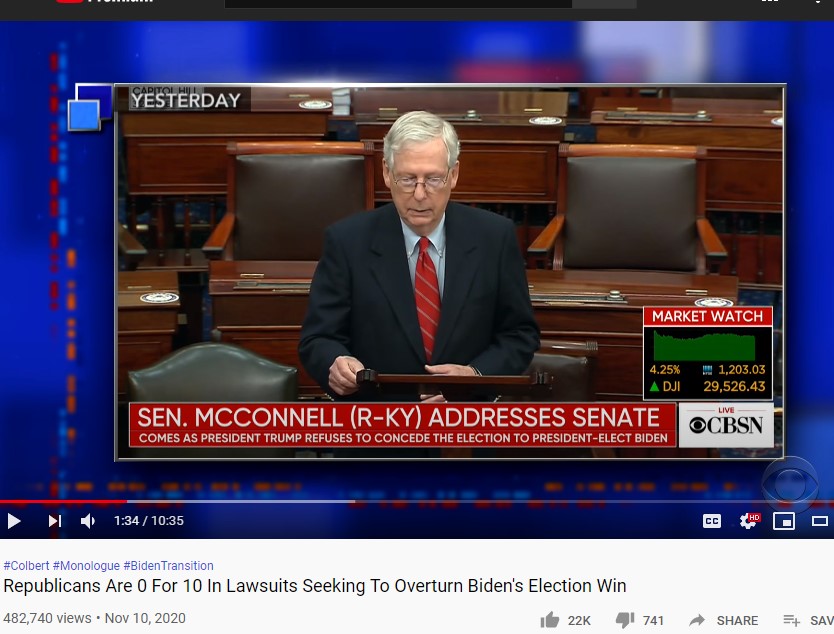 *spooky – as I was typing McConnell’s name I was also watching Colbert Nov. 10 show, on YouTube, I was about to open another tab to spell check his name, just as he shows up on this video, as Senate Majority Leader, 1:41 into the video; convenient label across the screen has his name.